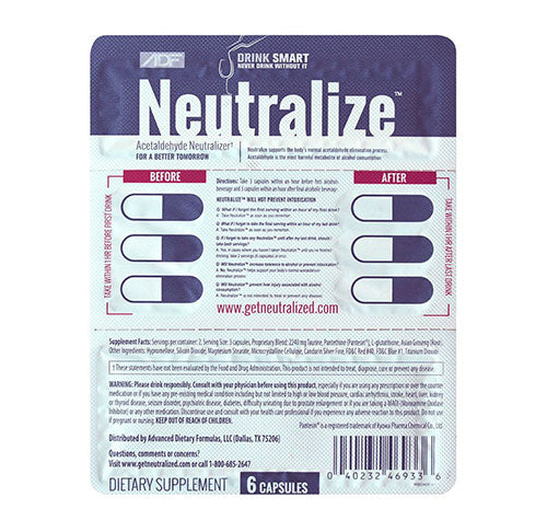 Neutralize reduces acetaldehyde, which is the main carcinogenic metabolite resulting from alcohol (ethanol) consumption. As a matter of fact, a key ingredient in Neutralize reduced acetaldehyde by 100% after 50mls of alcohol (ethanol) was consumed by human subjects compared to placebo.