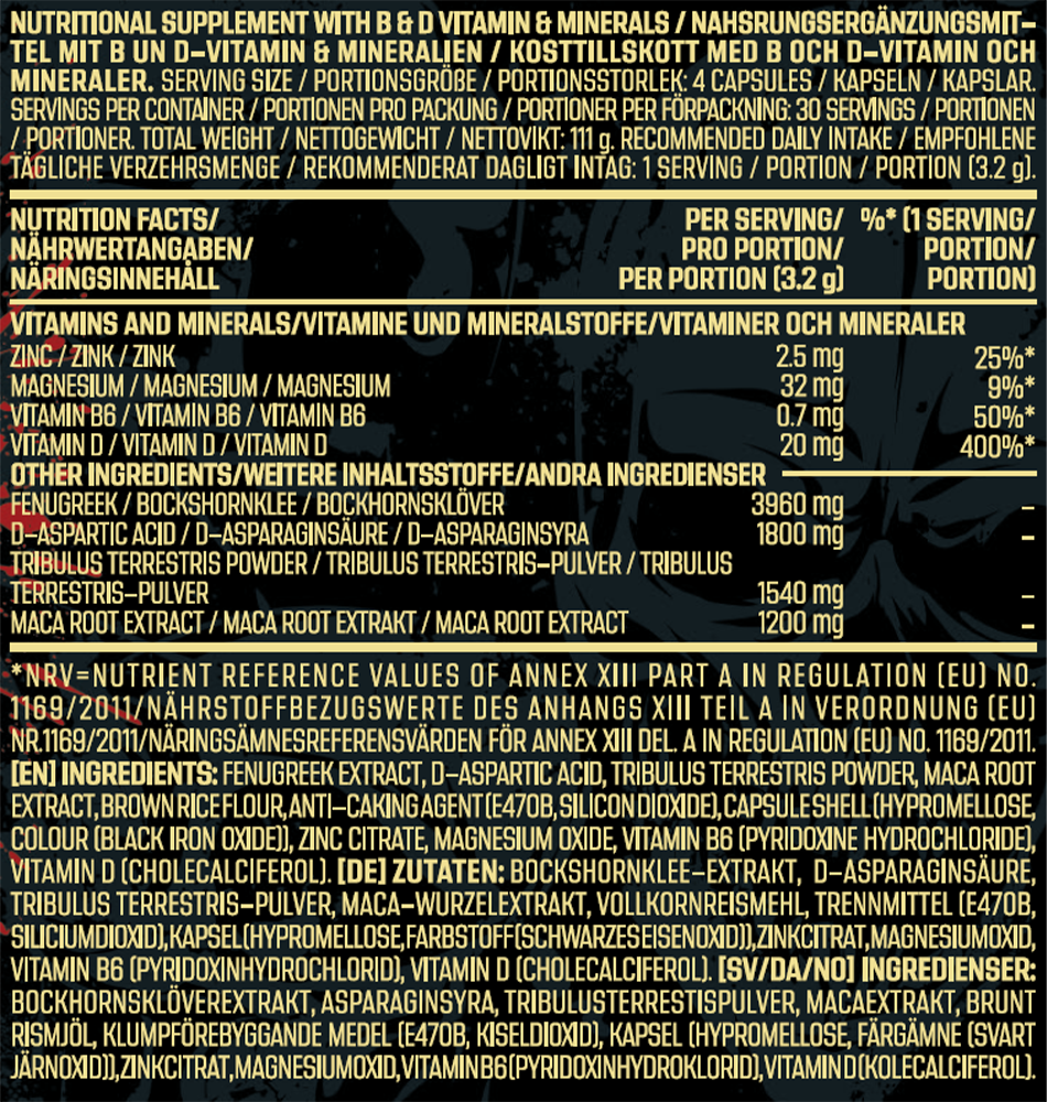 Combined with other active ingredients such as Fenugreek, vitamins B6 and D3 and the popular Zinc, this is a supplement that goes straight to the guns. But be aware: only take it when you’re absolutely ready to go hard!