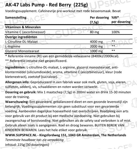 AK-47 Labs PUMP offers a potent blend of L-Citrulline-DL-Malate, L-Arginine, Glycerol Monostearate and vitamin C to support energy levels and help reduce fatigue.
