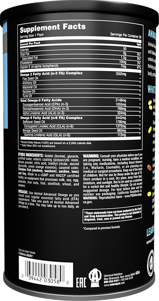 Animal Omega by Universal Nutrition is a no-compromise essential fatty acid formula for serious athletes. Each daily pack delivers a precise blend of omega-3 and omega-6 fatty acids from 10 high-quality sources. With 4000 mg of omega-3, including flaxseed, salmon and herring oil, and 2500 mg of omega-6, this powerful formula covers your bases. It also provides 450 mg EPA and 350 mg DHA. A daily intake of at least 250 mg EPA and DHA supports heart function, while DHA plays a role in normal brain function. Animal Omega gets the job done, no excuses.