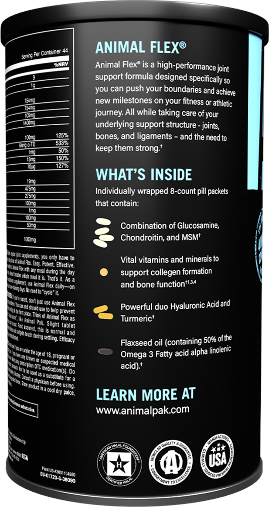 Animal Flex is made for lifters who put their joints through the grinder and need to stay in the game. This complete formula blends glucosamine, MSM, chondroitin, collagen and hyaluronic acid with powerful extras like turmeric, ginger root and boswellia extract. It is backed by vitamins and minerals including vitamin C for collagen formation, vitamin E to help protect cells from oxidative stress, and zinc, selenium and manganese to maintain strong bones. Available in no-nonsense daily packs, Animal Flex keeps your foundation solid.