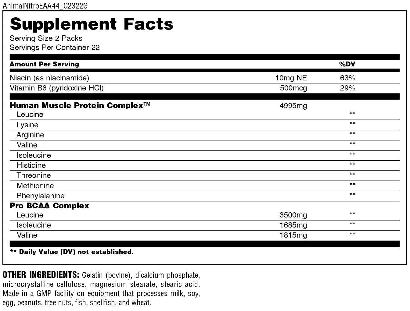 Animal Nitro is a straight-up essential amino acid (EAA) formula for lifters who mean business. Each sachet delivers 6000 mg of EAAs, including BCAAs like leucine, isoleucine and valine. Amino acids are the building blocks of protein. Protein contributes to muscle growth and helps maintain muscle mass. Hardcore recovery support, every time you train.
