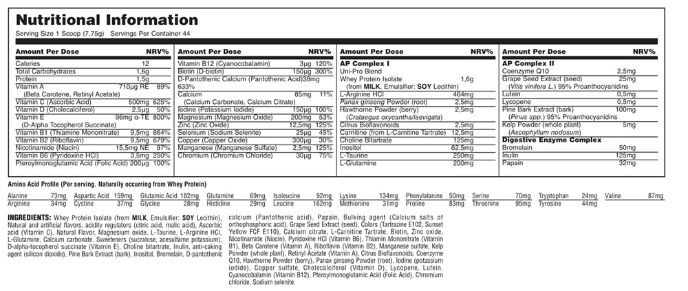 | Performance Complex Uni-Pro Blend (Whey protein isolate, panax ginseng (root), hawthorne (berruy), citrus bioflavonoids (peel) |