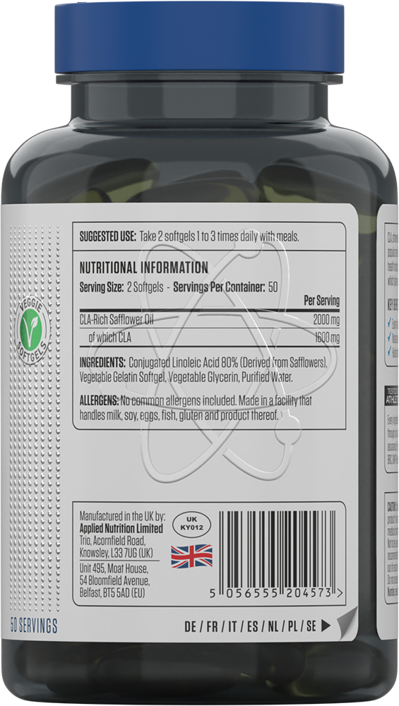 Applied Nutrition CLA Gold 1000 provides you with a potent dose of CLA, packed in vegetarian softgels. The ingredients and softgels are athlete tested to ensure premium quality.
