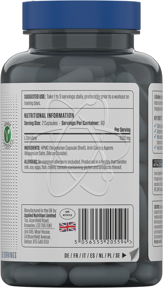Applied Nutrition L-Citrulline 1500 easily increases your daily L-Citrulline intake. Being vegan friendly and halal certified, the capsules are suitable for a variety of diets.