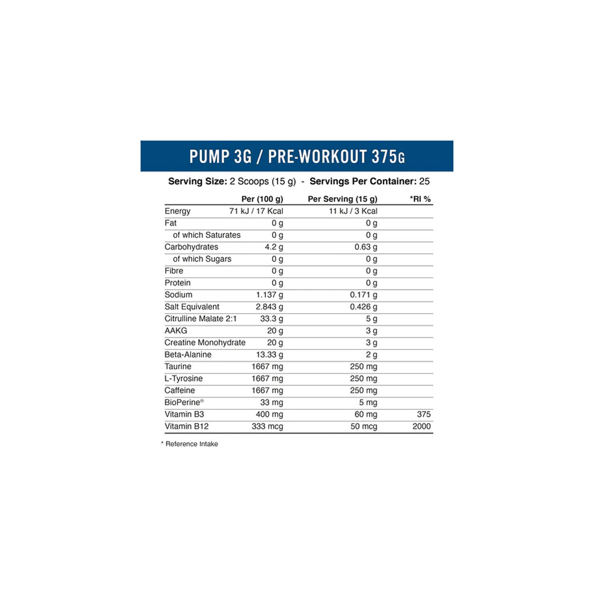 Applied Nutrition Pump 3G Pre-Workout is the next generation in pre-workouts, now more concentrated than ever. Each serving is packed with incredible doses of Citrulline Malate 2:1, AAKG, Beta-Alanine, Taurine, L-Tyrosine and Creatine Monohydrate.