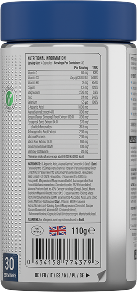 Applied Nutrition Test-X provides a carefully formulated blend of essential vitamins, minerals and plant extracts, including Avena Sativa, Korean Root, Fenugreek Seed, Maca Root and Ashwagandha Root.