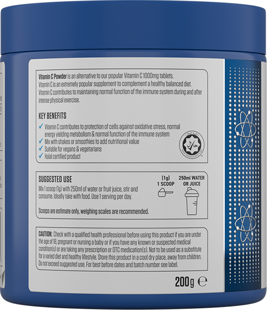 Mix one scoop of Vitamin C Powder (1 g) with 250 ml of water. For best results, consume with a meal.