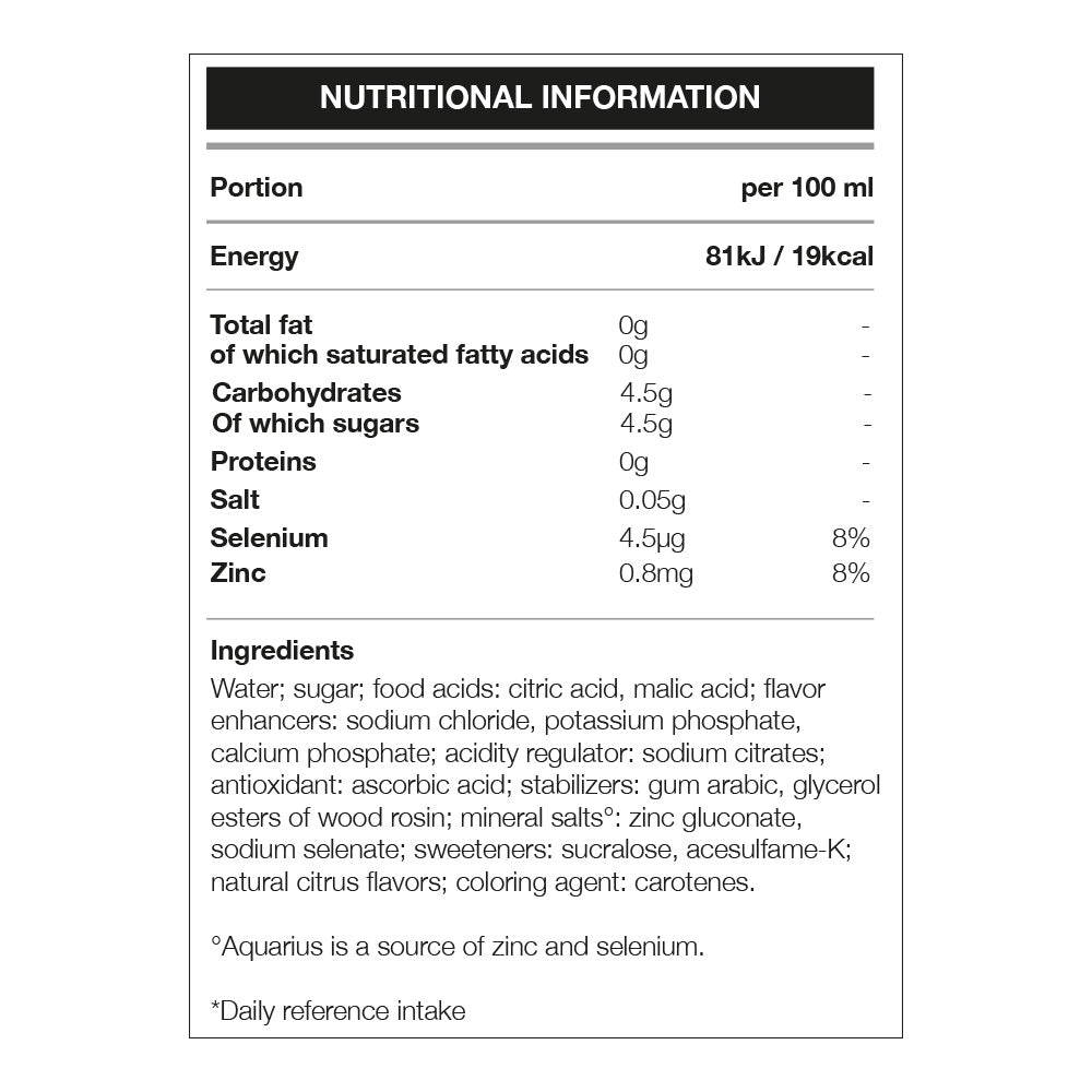 Aquarius Orange is low in calories and offers a refreshing orange taste complemented by Zinc and Selenium. Aquarius Lemon offers a cooling, fresh lemon taste enhanced with vitamin B6.