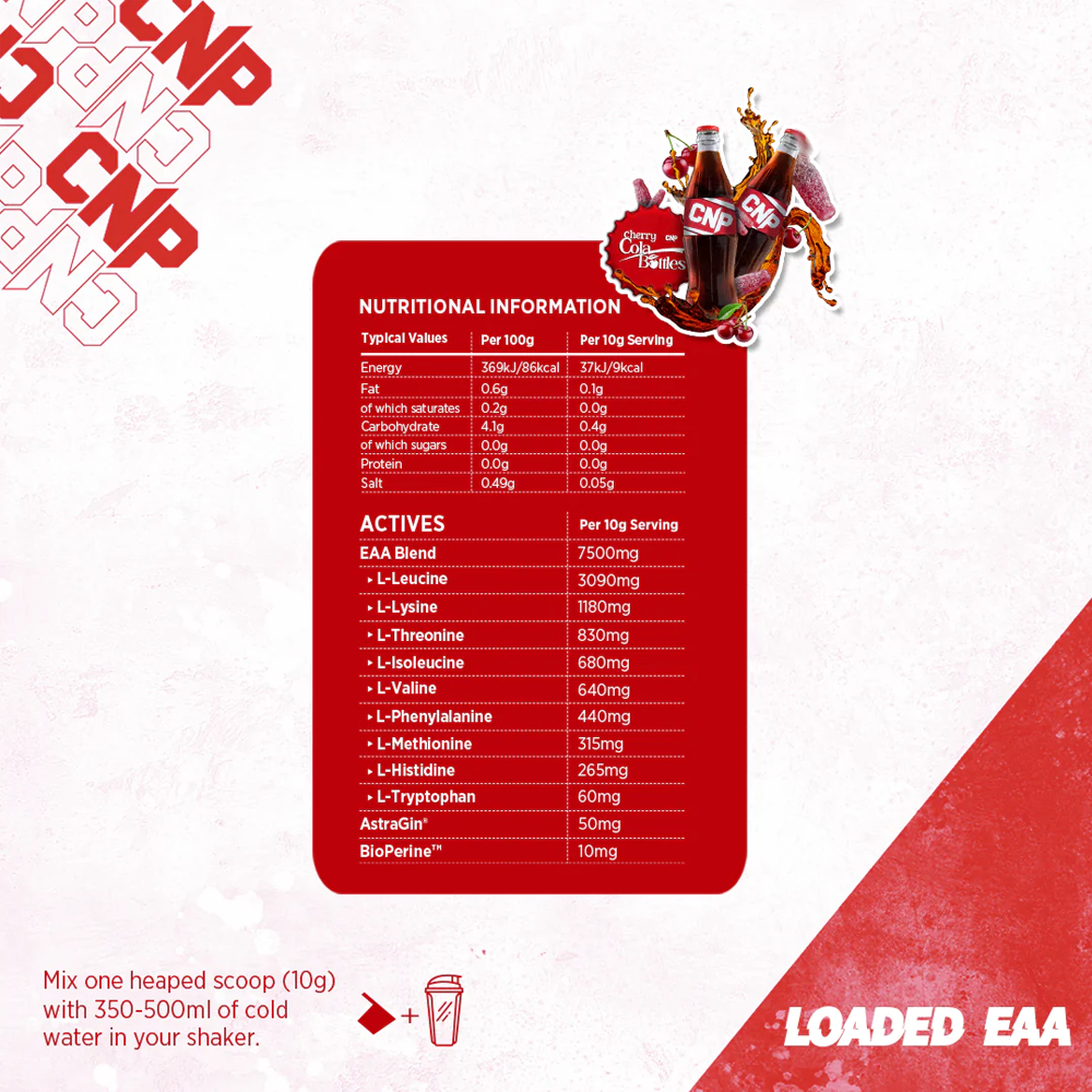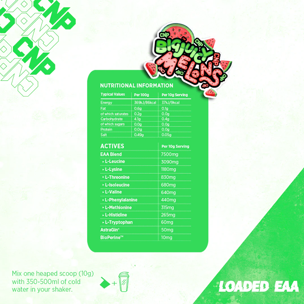 Discover the power of EAA amino acids with CNP Loaded EAA! CNP Loaded EAA contains premium EAA’s specifically formulated to be high in Leucine and to provide you with all the branch amino acids as part of a premium recovery blend.