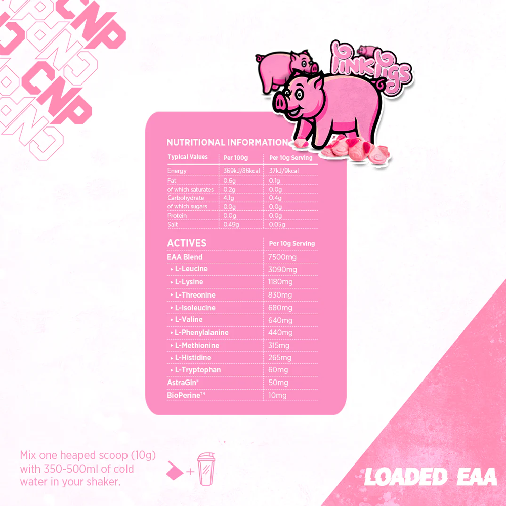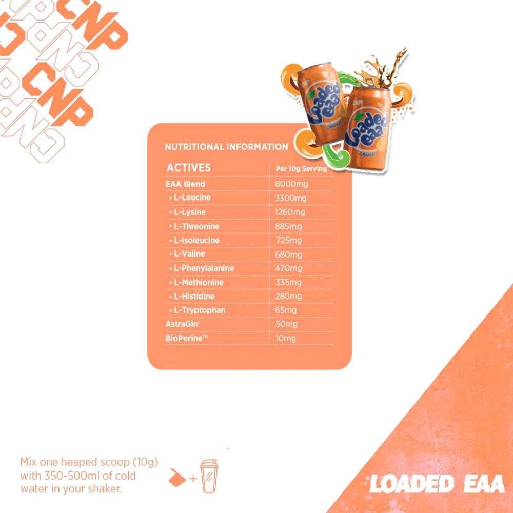 CNP Loaded EAA is an easy way to add all 9 essential amino acids to your daily diet. Each serving is packed with 7,5 grams of EAA blend, including up to 3090 mg of L-Leucine. Together with Astragin® and Bioperine, it is a potent and powerful formula for any athlete.