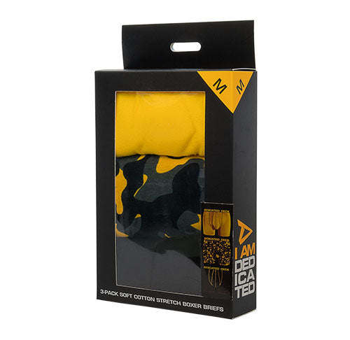 One pack contains three variants: Yellow fabric, Camo print and Black fabric with yellow stitching. All boxers feature a black waistband with yellow Dedicated wordmark.