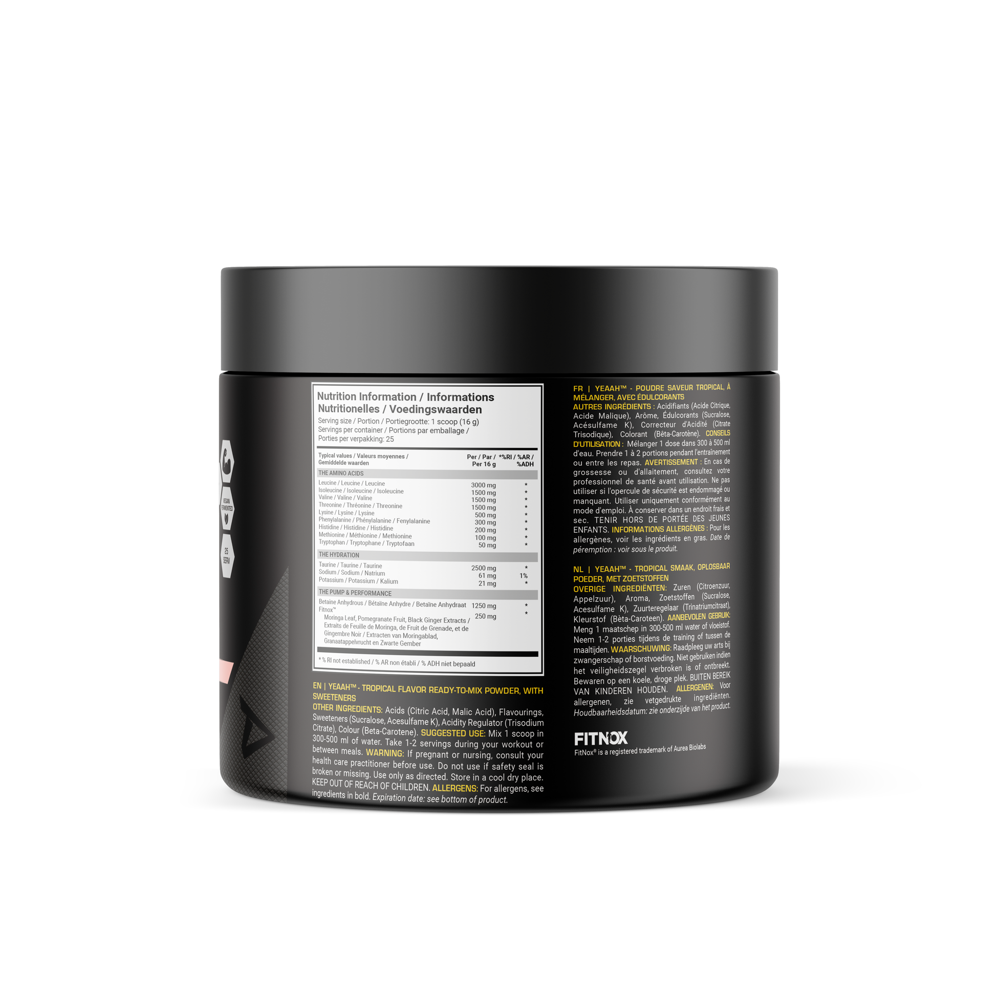 FitNox® is a patented plant complex that takes the YEAAH formula to the next level. FitNox® is a 100% plant-based ingredient without stimulants, developed for uncompromising athletic performance. Ideal as a non-stim supplement for both strength and endurance athletes, as it can dramatically improve pump, endurance and motivation. FitNox® is so powerful that it works better the more you use it.