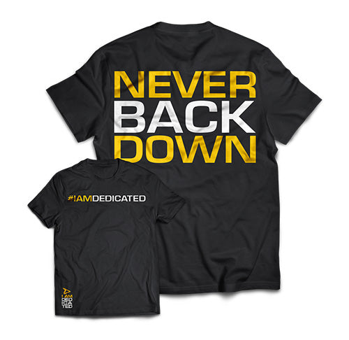Dedicated Nutrition branded t-shirt with 'Never Back Down' print.