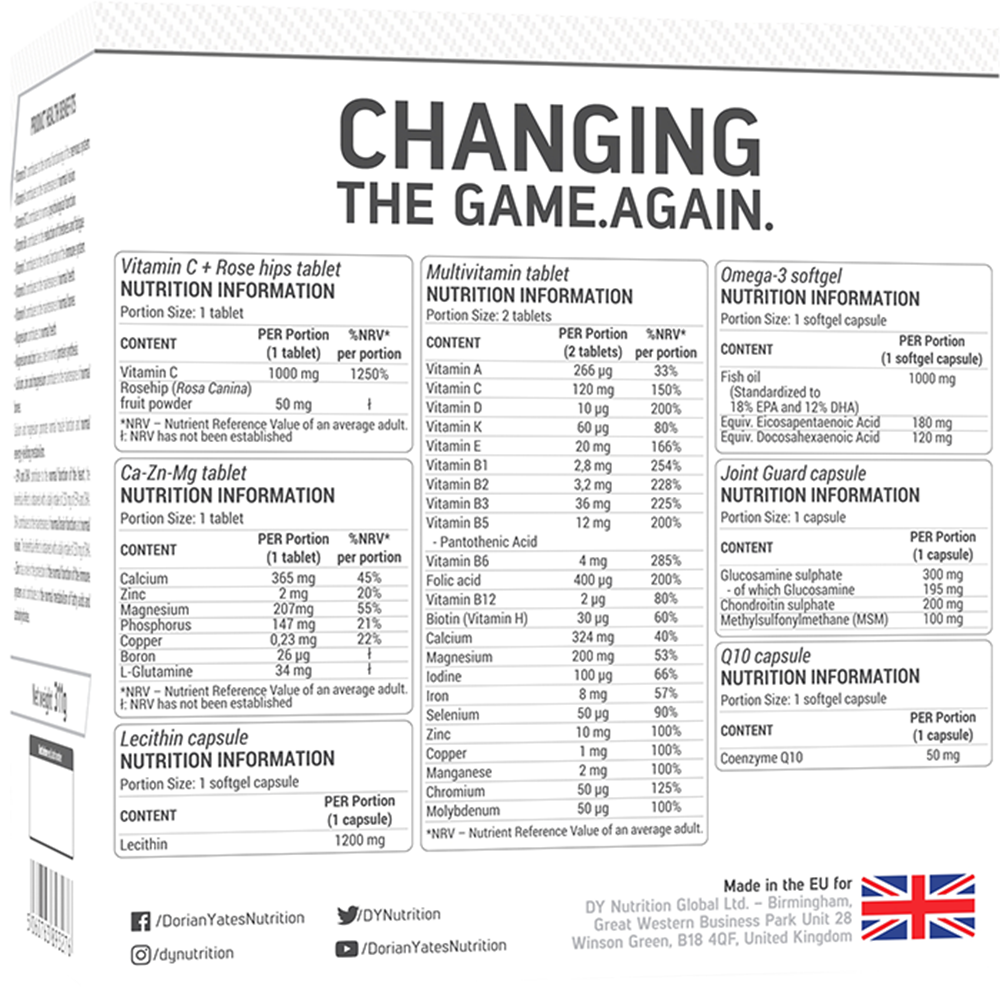 Dorian Yates Nutrition HIT Pack Complex is a premium daily supplement pack developed to support overall health, recovery, and performance. Designed by six-time Mr. Olympia Dorian Yates, this comprehensive formula includes a balanced combination of essential vitamins, minerals, and omega-3 fatty acids. Each convenient sachet delivers nutrients to help maintain your body from head to toe. Vitamin C contributes to the normal function of the immune system, while vitamin B6 helps reduce tiredness and fatigue. Magnesium supports normal muscle function and contributes to normal protein synthesis. For bone health, calcium, vitamin D, and vitamin K play a vital role in maintaining normal bones. Omega-3 fatty acids EPA and DHA contribute to the normal function of the heart, while DHA also supports the maintenance of normal brain function and vision (with a daily intake of 250 mg).