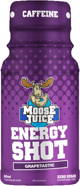 Moose Juice energy shot, containing caffeine. Grape flavoured energy shot, with sweeteners.