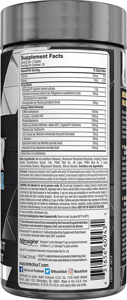 Each full serving of three caplets is packed with large doses of Caffeine Anhydrous, N-Acetyl-L-Carnitine HCI, L-Theanine, Pomegranate, Theacrine and more. Simply swallow the caplets and feel your workout shatter!