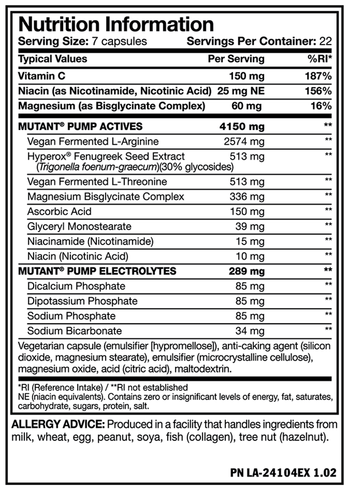 The Mutant Pump Actives is a total blend of more than 4 gram of powerful ingredients, including (vegan fermented) L-Arginine, Hyperox® Fenugreek Seed Extract, (vegan fermented) L-Threonine, Magnesium and more!