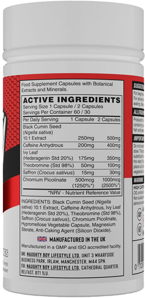 In addition to ingredients like Caffeine, Ivy Leaf and Chromium Picolinate, Naughty Boy Shred OG’s energy matrix also contains the age-old used ingredients Nigella Sativa and Saffron.