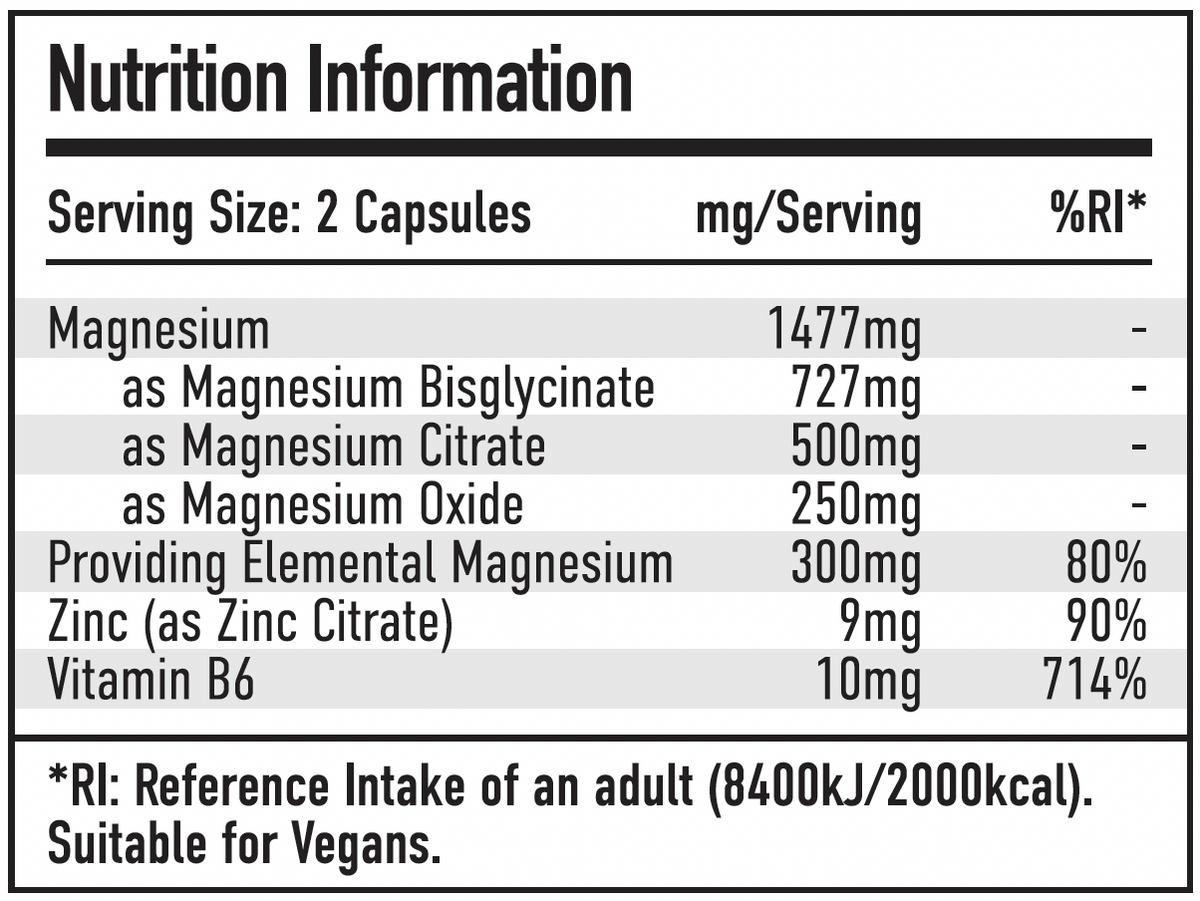 Take 2 capsules per day, preferably 30–60 minutes before bedtime. Each serving delivers 300 mg of elemental magnesium, 9 mg of zinc and 10 mg of vitamin B6.