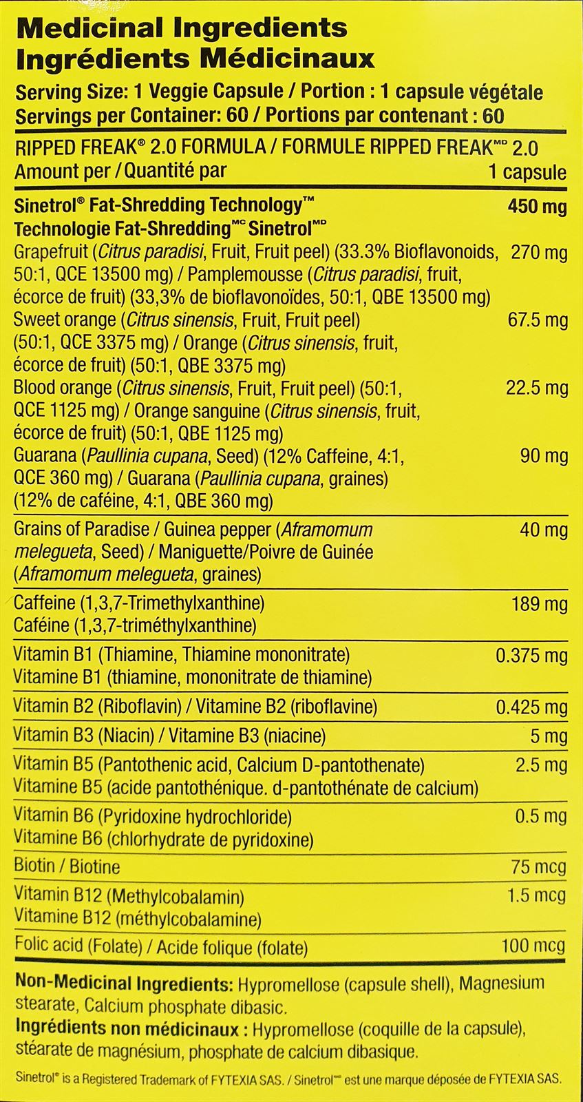 PharmaFreak Ripped Freak 2.0 is a high-intensity burner formula built for those who want serious support in line with their active lifestyle. Packed with Sinetrol—a patented blend of grapefruit, sweet orange, and blood orange extracts. It also features guarana, grains of paradise, and 189 mg of caffeine. The formula is further enhanced with a full spectrum of B vitamins including B1, B2, B3, B5, B6, biotin, folic acid, and B12, which support normal energy-yielding metabolism and help reduce tiredness and fatigue. Designed for daily use, it fits effortlessly into your performance-focused routine.