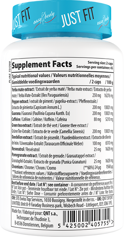 LIPITEK contains many natural ingredients, including yerba mate extract (250 mg for 2 caps), which has antioxidant properties and can contribute to stimulate the metabolism, a very beneficial extract during calorie restricted periods. LIPITEK also combines guarana and caffeine for added stimulant effect, helping the metabolism of lipids and the control of body weight. Green tea extract has been proven to help with weight control and offers many other benefits, such as tonic and antioxidant properties. The dandelion extract present in LIPITEK's formula provides a diuretic effect, helping the body to detox and eliminate excess water. The Chromium added to the formula adds more benefits as it contributes to normal macronutrient metabolism and to the maintenance of normal blood glucose levels.