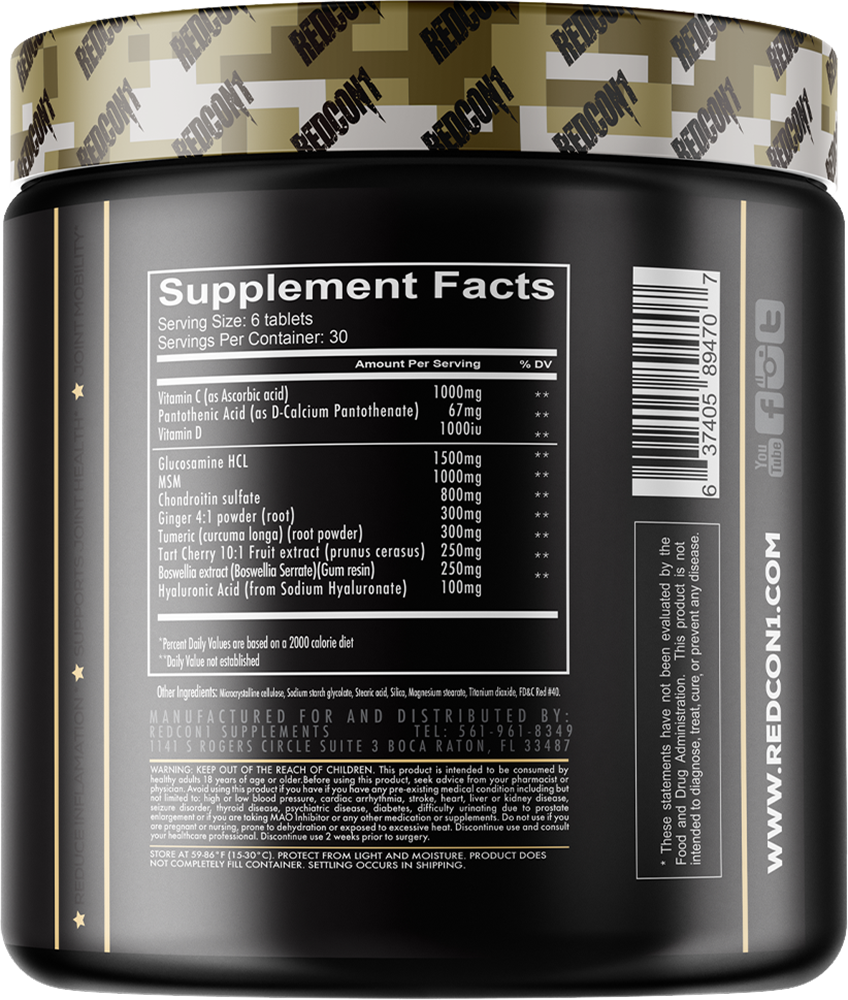 Redcon1 Foxtrot is a comprehensive joint support formula built to keep you moving and performing at your best. It combines trusted ingredients like glucosamine, chondroitin sulfate, and MSM, which are naturally present in cartilage. Vitamin C contributes to collagen formation, supporting the structure of bones and cartilage, while vitamin D plays a role in maintaining strong, healthy bones. With added hyaluronic acid, boswellia, ginger, turmeric, and tart cherry extract, Foxtrot is ideal for anyone serious about joint care and long-term mobility.