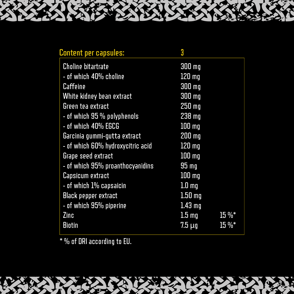 Viking Power Dragon Fire Fat Burner is designed for those who want a fat burner on a whole new level! Each serving is on fire with 300 mg of Caffeine, 250 mg Green Tea Extract, 100 mg of Cayenne Pepper Extract and 300 mg of Choline Bitrate.