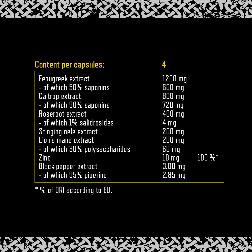 Viking Power Odin Testo Booster is a powerful supplement that contains a potent combination of known, powerful ingredients in high doses. A daily serving provides you with up to 1200 mg of Fenugreek and 800 mg of Tribulus Terrestris, 90% of which are saponins.